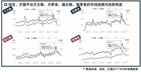 近两年来,淘宝、天猫平台犬主粮、犬零食、猫主粮、猫零食的市场规模均涨势明显。
