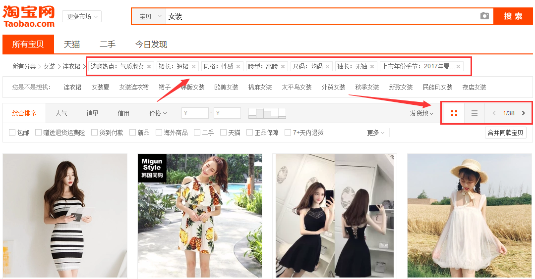 格、品牌、材质、每个人的购买习惯等都是非常多样化的。而在这里只有和你相同,相似的宝贝才有可能和你产生竞争的交集,这样进过了筛选后的竞争对手会少很多!女装这个几百万宝贝的大类目,当我们限制条件之后,就会发现,类似的宝贝却只有38页了,那就仅仅1800多个宝贝而已了。